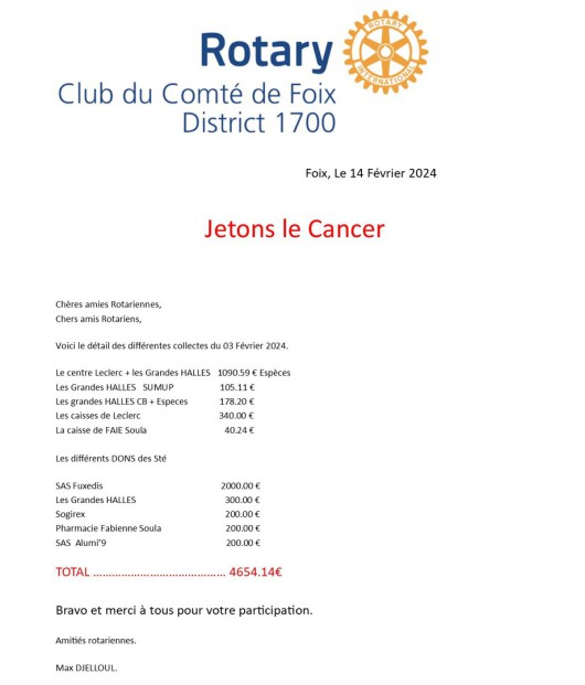 Réponse de François Schmutz, membre du RC Strasbourg et responsable Jetons Cancer pour le district 1680: